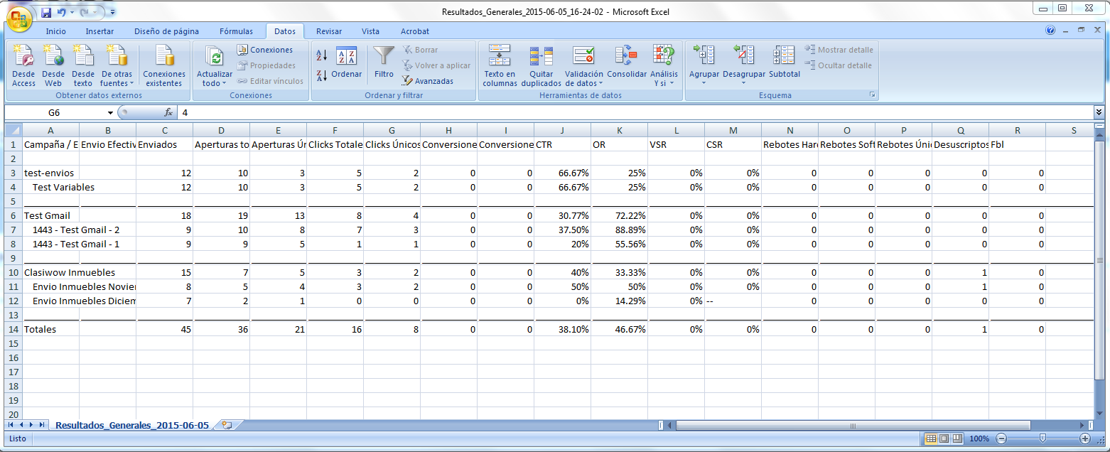 En el panel de Resultados tenemos todas las estadísticas agrupadas por los distintos Envíos de Campaña.